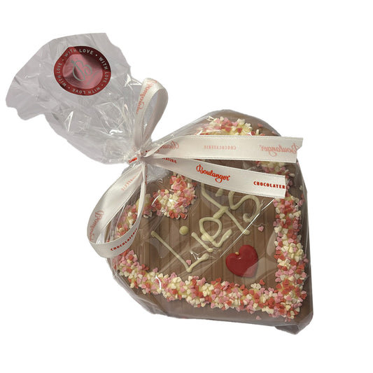 Dit prachtige hart is een perfect cadeau voor de liefdevolle dagen. Gemaakt van heerlijke melkchocolade en gedecoreerd met mini hartjes en de tekst Liefs in witte chocolade