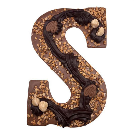 Een speciale letter met knapperige hazelnootstukjes en sierlijke opspuit decoratie.