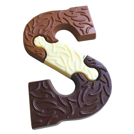 Een speelse chocoladeletter in puzzelvorm, gemaakt van melk-, puur- en witte chocolade. Leuk om te bekijken én op te eten.