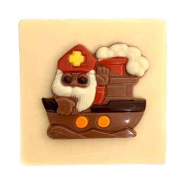 Een witte chocolade tablet met een kleurrijke Sint opleg. Een vrolijke lekkernij voor pakjesavond.