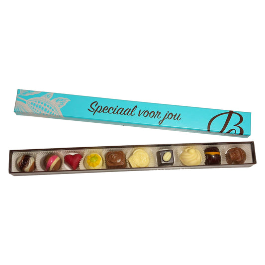 Een persoonlijk cadeautje voor elke gelegenheid. Dit smalle doosje met 10 bonbons is net zo bijzonder als de ontvanger.