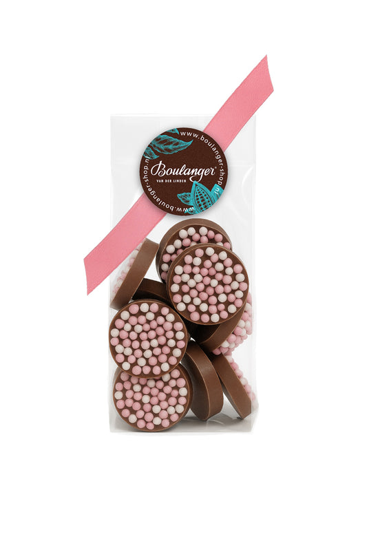 Heerlijke flikken met een romige draai op beschuit met roze muisjes.